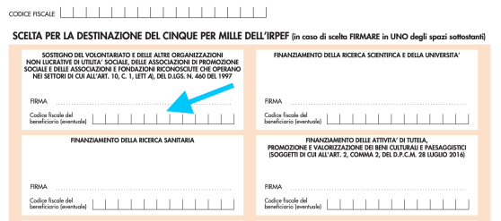 Indica il codice fiscale di Arca Solidale: 97749120016 nella casella indicata dalla freccia azzurra e apponi la tua firma nell’apposito spazio; in alternativa informa il tuo commercialista.